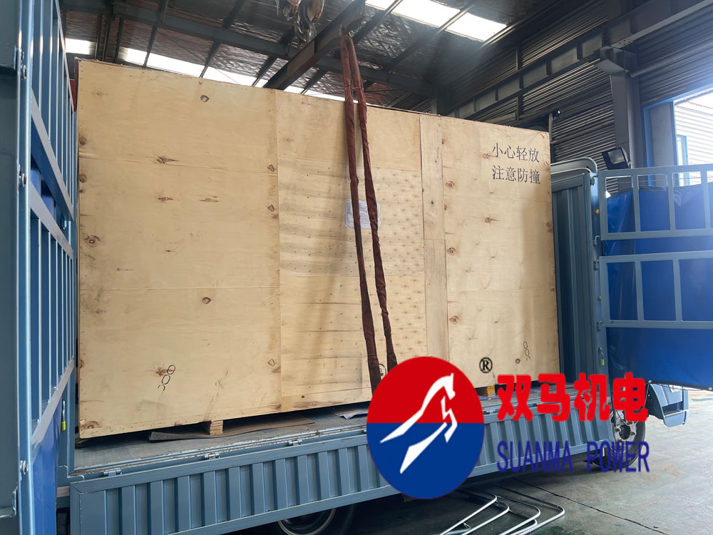 客戶國外項目訂購的800kva今日到工廠提貨裝車發(fā)運,800kva濰柴動力木箱包裝后尺寸3850*1720*2320mm,整套機器5000KG.